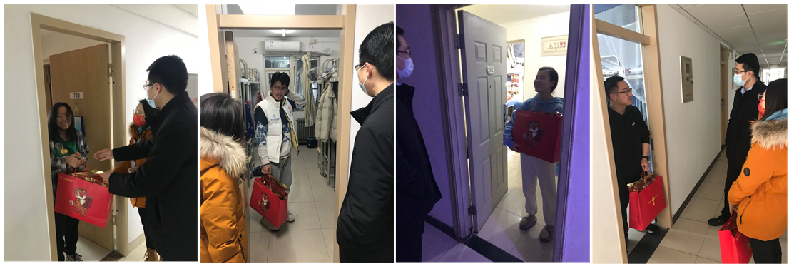 在两校区的留校学生宿舍,学院负责人仔细询问同学们的假期生活学习安排,关心是否存在困难,叮嘱同学们与家人常连线、云过年,并送上春节大礼包,预祝同学们新春快乐。
