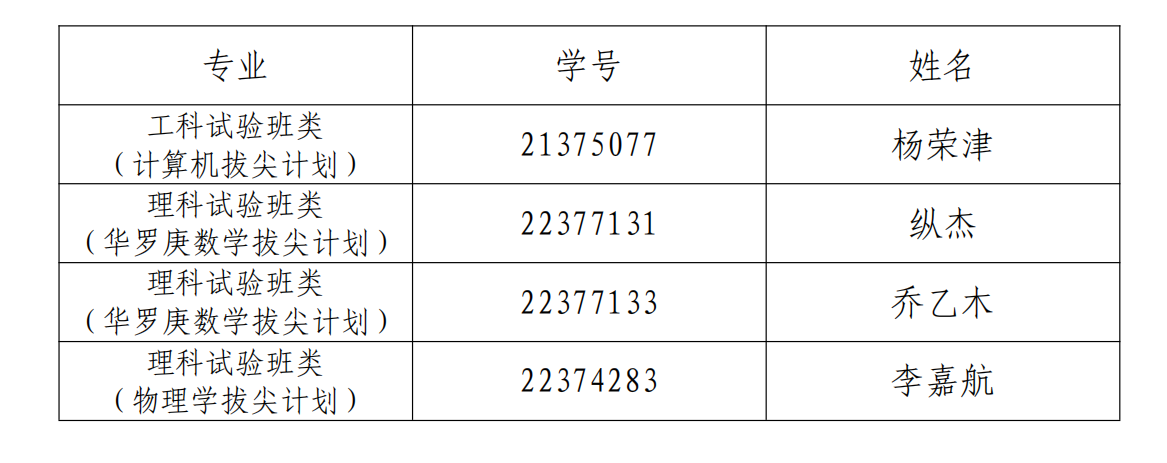 经学生申请、拔尖基地初审、专家面试、成绩复核,根据《北京伊人99高等理工学院学生动态管理实施办法》、《计算机科学拔尖学生培养基地学生动态管理实施办法》、《华罗庚数学拔尖学生培养基地学生动态管理实施办法》、《物理学拔尖学生培养基地学生动态管理实施办法》等相关规定,拟增选以下4名学生为高等理工学院2022级学生。
